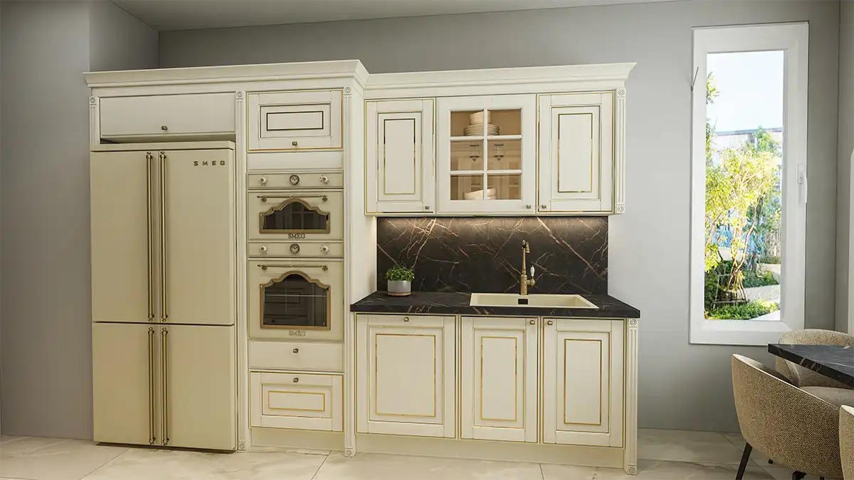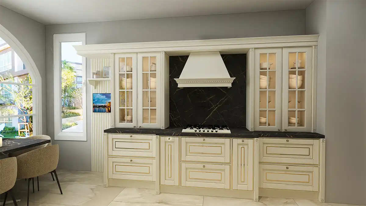 Bu özel mutfak, klasik stilin detaylarını modern konforla birleştiriyor; zarif formda çerçeveli kapaklar, cam vitrin modülleri ve altın vurgulu donanımlar ile İstanbul mutfak tadilatı projelerinde fark yaratıyor.
